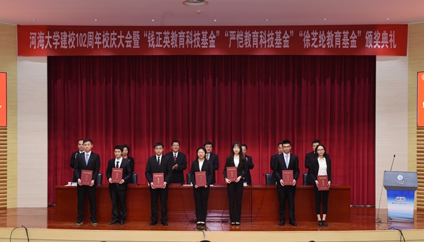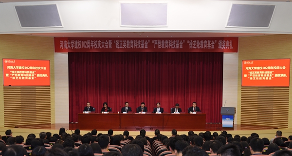 徐辉校长在讲话中指出,河海人治水兴邦的使命担当贯穿于学校百年发展历程。百年传承的河海精神文化,一脉相承、延绵至今,影响和造就了一批批学术大师、行业翘楚和国家栋梁,成为学校服务经济社会发展和国家水利建设的力量源泉。他强调,在102年发展历史中,学校始终站在中国水利高等教育及科技的最前沿,把成果书写在祖国大地上、应用在现代化建设伟大事业中。他希望,在新时代的起点上,我们要筑牢河海精神文化体系,坚定河海百年文化自信,以五大建设任务为牵引,以深化改革为抓手,以体制机制创新为保障,加快推进世界一流特色研究型大学建设,为决胜全面建成小康社会、夺取新时代中国特色社会主义伟大胜利、实现中华民族伟大复兴作出新的更大贡献!