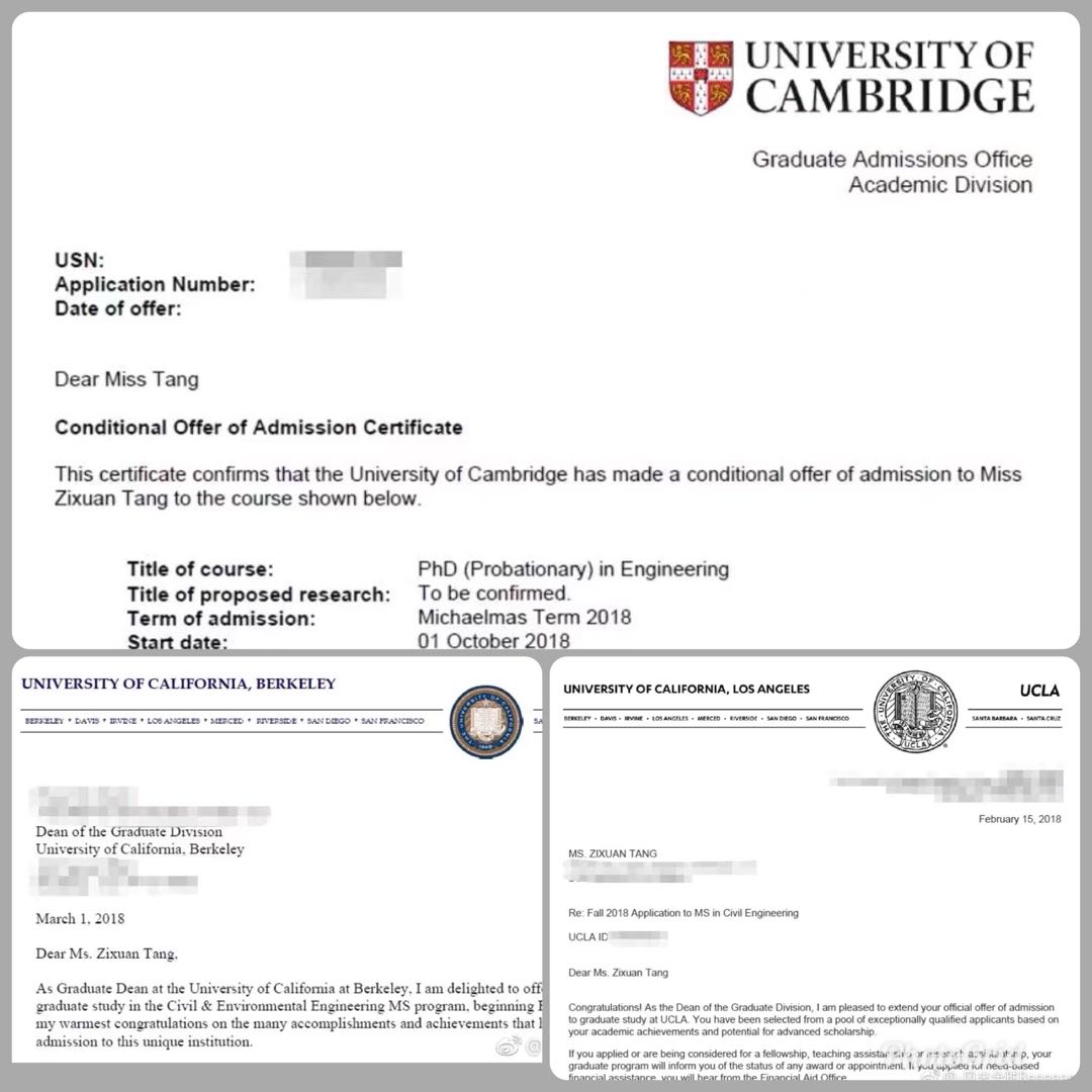 心向远方,勇闯世界。汤子璇从大一开始,便一心想去国外看一看不一样的世界。大三时,已经有能力保研国内一流高校的她,放弃了保研名额,选择了在大四来到美国加州大学洛杉矶分校交换学习。在国外紧张的学习氛围中她丝毫没有放松对自己的要求,努力地练习提高自己的英语听说读写能力,重视每一门课程的学习,雅思获得了两次总分8.0的高分。在学校里第一学期绩点3.925/4.0, 第二学期获得满绩点4.0的成绩,充分证明了她的学习能力和对自己的严格要求。在2017年底她完成了国外研究生的申请,并获得了剑桥大学土木工程博士、加州大学伯克利分校环境工程硕士、加州大学洛杉矶分校水文水资源工程硕士的录取通知,让大家无比敬佩。