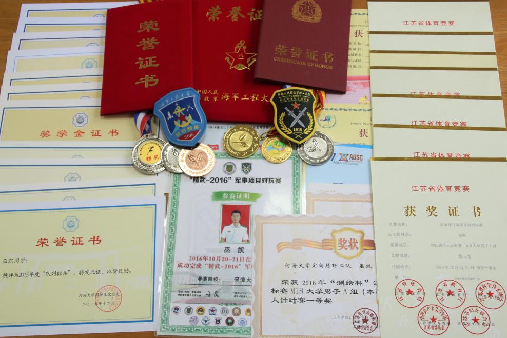 2016年暑假,巫凯和他的9位战友们来到海军工程大学代表我校参加“联合精英--2016”军事对抗赛。在武汉的40多度高温,48小时模拟作战环境下,他们背负重达30斤装备完成各项作战任务,即使面对军校对手也毫不示弱。在许多参赛选手出现中暑、体力不支被迫退赛治疗甚至抢救的情况下,他和其他队员坚持完成了比赛,并获得了 行军宿营第三名、轻武器射击第三名的好成绩。