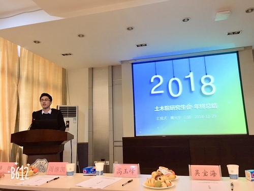 他说学生组织从学生中来,也该回到师生中去。研会一年的十几场院校级活动,有新生杯的球类比赛,也有各种讲座和培训,有汗水有欢乐,服务工作光靠一个人是远远不够的,成功的活动离不开每一位研会人的付出。在大家的共同努力下,土木院研究生会也在2018年校研究生会考核中评选为“优秀研究生会”。