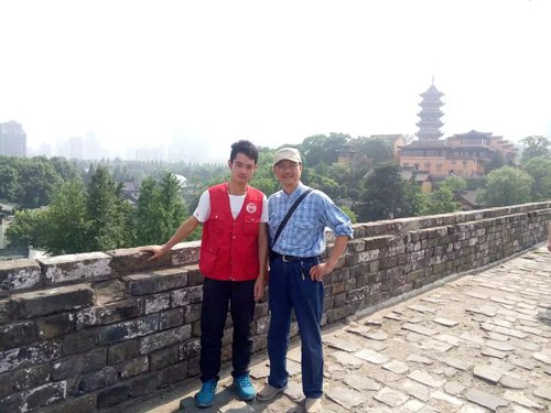 除了支教和社团工作外,最令张书剑记忆犹新的活动,要数在明城墙上的志愿讲解了。他在讲解时遇到过校友,遇到过老乡,遇到过外国游客,他在每次讲解的同时都会和对方聊聊,就当做是交朋友,顺便推荐南京的景点。“每带一批游客参观,就是陪他们走过一段人生,彼此的生命轨迹发生交叉,这种感觉很奇妙,所以我很喜欢这份工作。”张书剑微笑道。在南京明城墙志愿者风采讲解大会上,张书剑以幽默的语言,夸张的动作引爆了全场的笑点,虽然这不太符合讲解规范,最后只评了三等奖,但他说展示了自己的风格,给人们带来了快乐,这就足够了。同时他也被评为南京明城墙双语志愿服务优秀志愿者。