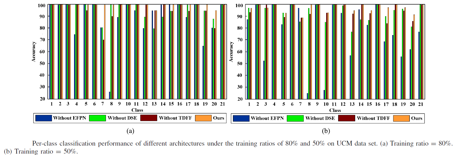 为探明不同模块在分类性能上起到的作用,进行了全面的消融实验,图6显示的是不同方案在UCM数据集每一个类别上的分类精度,可以看出,无论在哪个训练条件下,缺少EFPN的网络性能降低最显著,缺失CIF和TDFF的网络在部分类别上性能略微下降,而三者集合的方法取得优秀性能,这表明提出的方法每个模块都是有必要且有作用的。