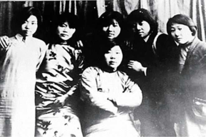 冷云(右二)1935年在桦川县立女子师范学校就读时与同学在佳木斯合影。(来源:新华网)