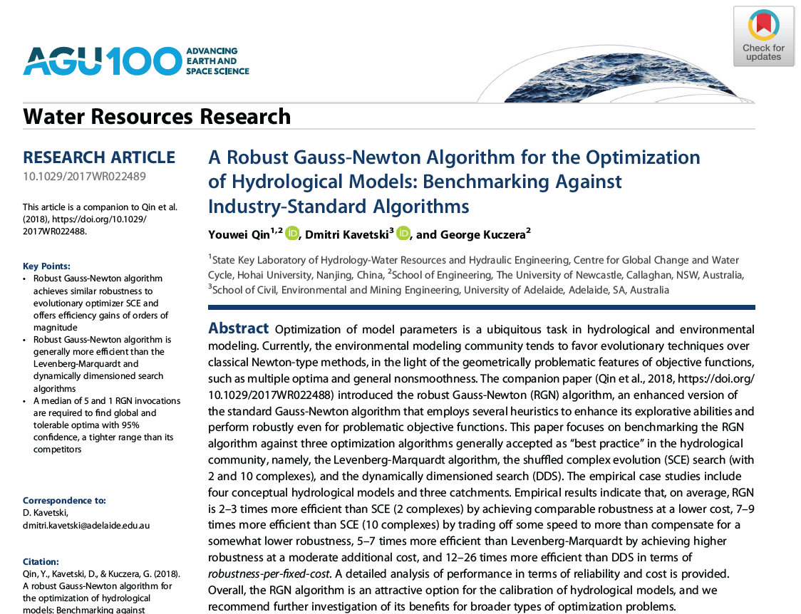 [3] Qin, Y., Kavetski, D., & Kuczera, G. (2018). A robust Gauss-Newton algorithm for the optimization of hydrological models: Benchmarking against industry-standard algorithms. Water Resources Research, 54, 9637– 9654.