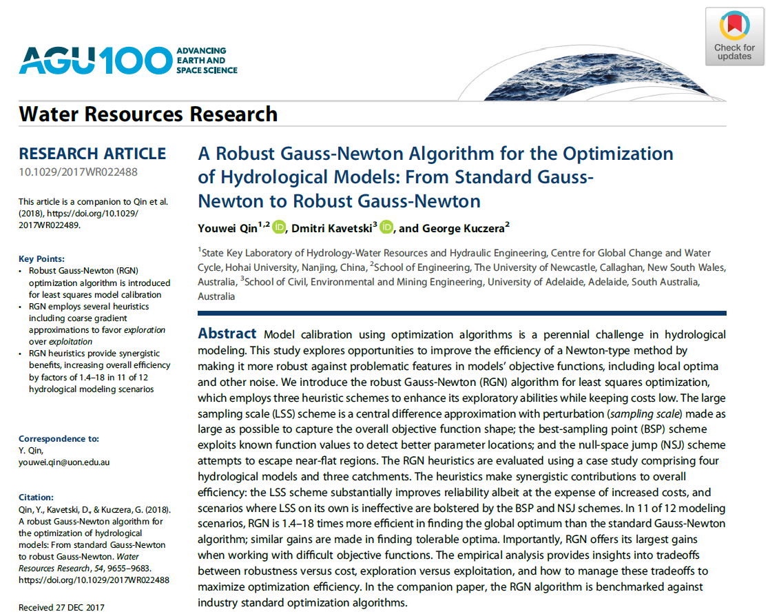[2] Qin, Y., Kavetski, D., & Kuczera, G. (2018). A robust Gauss-Newton algorithm for the optimization of hydrological models: From standard Gauss-Newton to robust Gauss-Newton. Water Resources Research, 54, 9655– 9683.