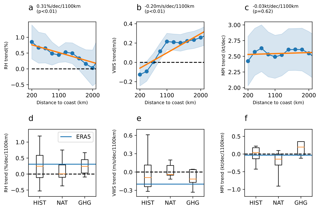 图2. 再分析资料中不同离岸距离范围内的相对湿度(a)、垂向风切变(b)和最大潜在强度(c)的上升趋势以及CMIP模式在全部强迫(HIST)、自然强迫(NAT)和温室气体强迫(GHG)条件下对相对湿度(d)、垂向风切变(e)和最大潜在强度(f)上升趋势的模拟。