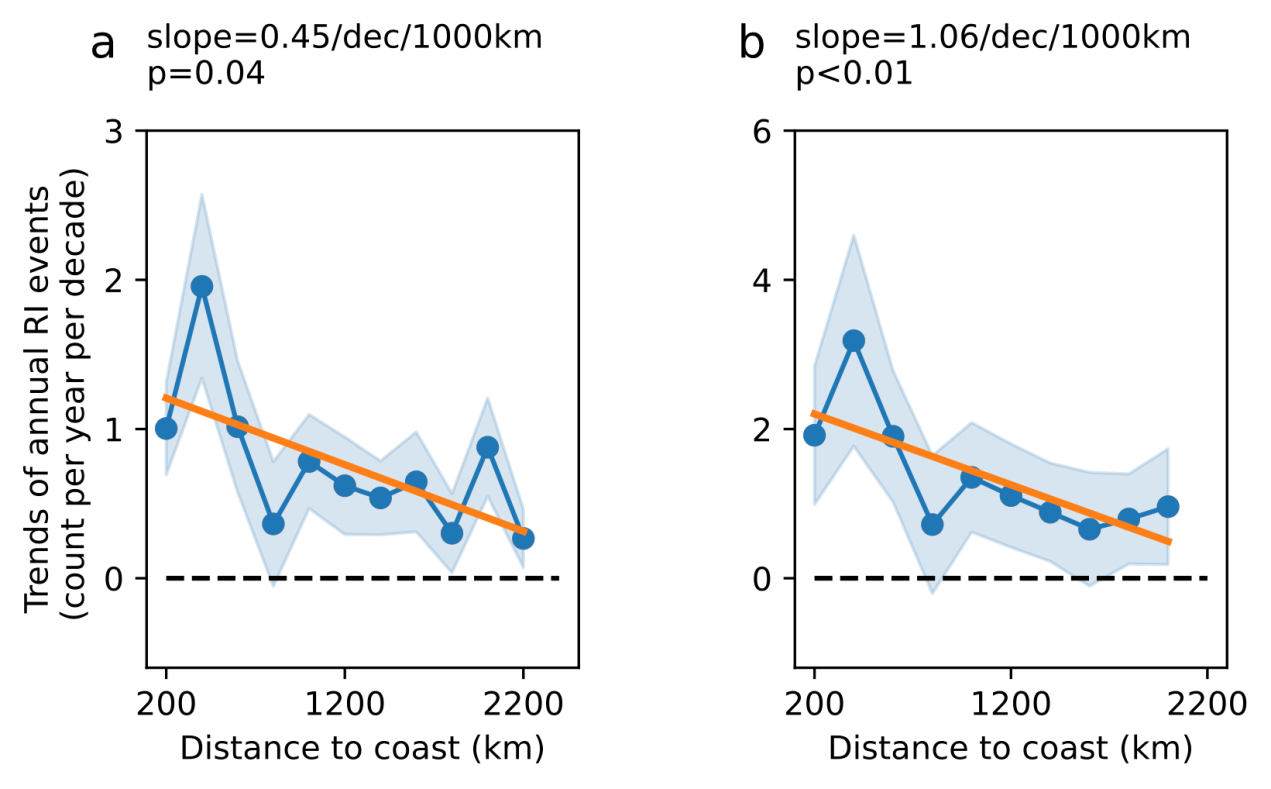 在这一研究中,海洋观测与预报技术研究团队发现,在全球范围内,离岸400km以内的快速增强现象迅速增加,从1980年代的5个/年增加到2010年代的15个/年,与此相反,开阔大洋区域的变化趋势不明显。同时,此上升趋势从近海到大洋几乎线性下降,幅度达到0.4个(1.06个)/10年/1000km。