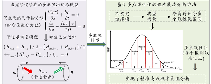 在异质多能流分析方面,建立了考虑管道管存的多能流准动态模型,提出了基于边界紧缩-凸包松弛的多能流准动态运行模型,实现了异质综合能源资源的统一表征;定量分析了异质能流方程非线性特征,提出了基于多点线性化的概率能量流分析方法,克服了传统概率能流分析模拟法计算复杂度高、解析法计算精度低的不足。