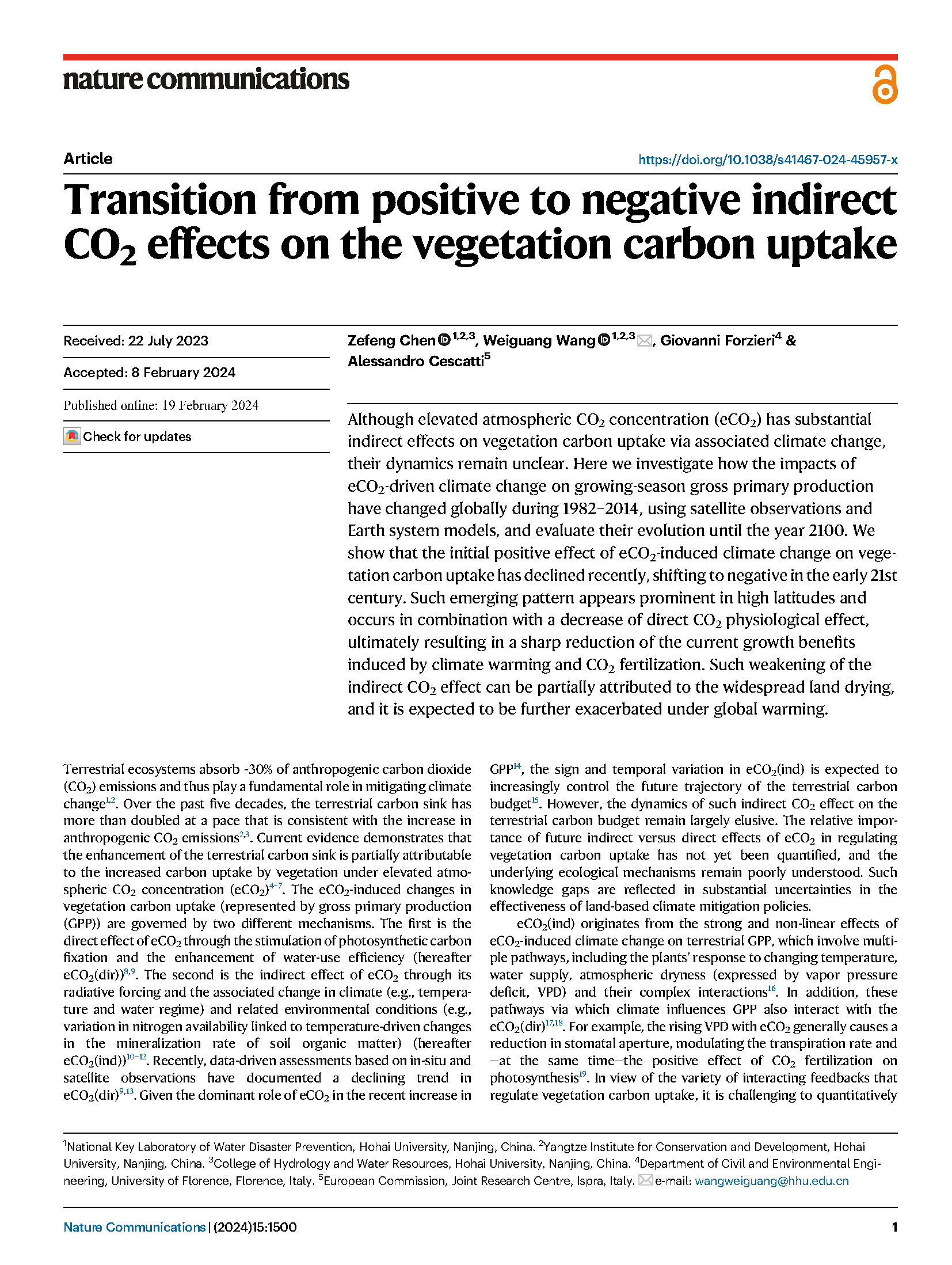 论文信息:Zefeng Chen, Weiguang Wang*, Giovanni Forzieri, & Alessandro Cescatti (2024). Transition from positive to negative indirect CO2 effects on the vegetation carbon uptake. Nature Communications, http://www.nature.com/articles/s41467-024-45957-x.