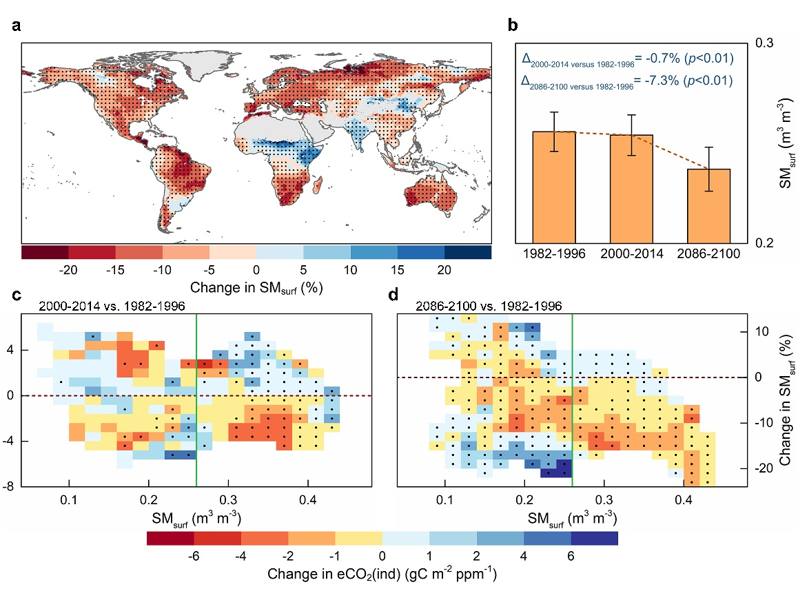 大气CO2浓度的升高显著地影响植被碳吸收,进而引起陆地碳收支情况的剧烈变化。CO2对植被碳吸收的直接生理影响(即CO2施肥效应)呈现减弱态势已经得到了广泛的认识,CO2还会通过引起气候变化而对植被碳吸收施加间接影响,但其演化过程目前尚不明确且缺乏系统的定量研究。此外,鉴于陆地水循环与碳循环间的高度耦合关系,水文条件的变化在其中究竟扮演着怎样的角色目前也没有清晰的认知。针对上述科学问题,我校王卫光教授团队同时利用遥感观测数据和地球系统模型控制试验结果在全球尺度上探究了CO2间接影响在过去三十多年间的演变规律(图1),并预估了在高排放情景SSP5-8.5下该影响的潜在变化趋势,最后进一步解析了土壤水分条件变化对CO2间接影响的内在调节机制(图2)。