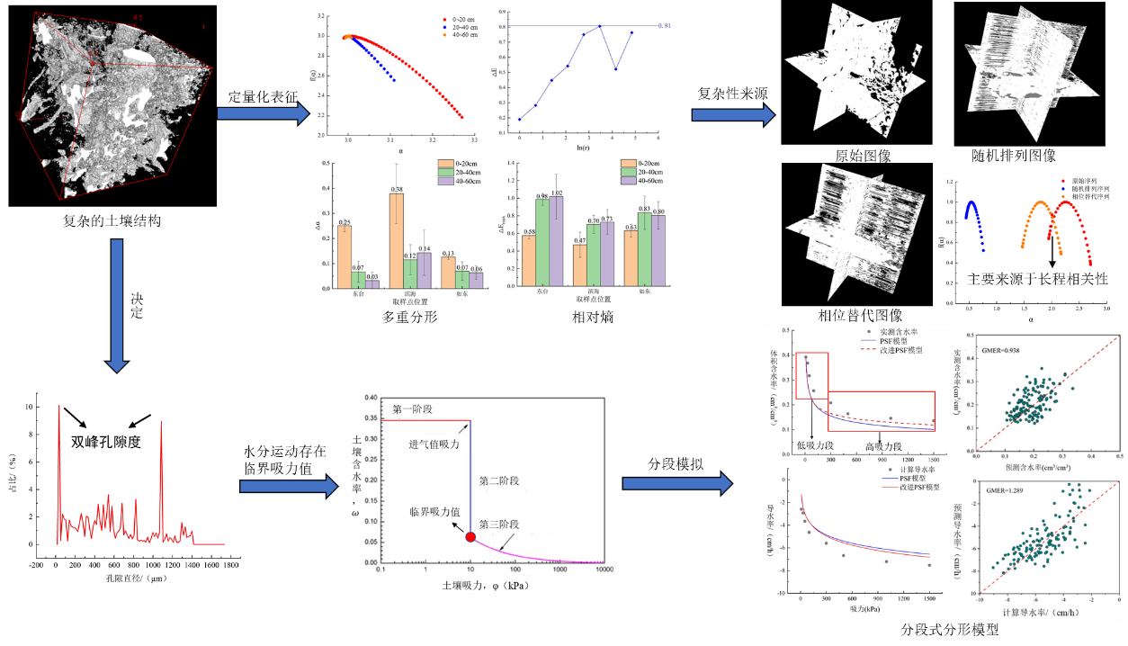 沿海地区是我国重要的粮食产区,合理开发沿海土地可以缓解耕地短缺问题。由于沿海地区降雨蒸发过程强烈,加之海水入侵的影响,土壤干湿交替频繁,土壤结构演变与水土迁移过程具有鲜明特色,交互影响机制复杂。但土壤是一个“黑箱”,其内部可变的复杂微观孔隙结构和动态水文过程难以直接通过传统的物理技术和理论体系进行直接观测和定量化描述。该系列成果通过融合CT扫描和图像处理技术,结合分形几何学和波动分析法等理论方法,直观展示了土壤三维孔隙结构的演变规律,阐明了土壤孔隙结构的复杂性及其来源,并采用数学方法模拟预测了土壤水力性质及水盐运移过程。该系列研究可为沿海地区盐碱地水土资源高效利用与保护提供理论支撑,相关成果2023年获得“第十五届中国水土保持科学技术奖”二等奖。