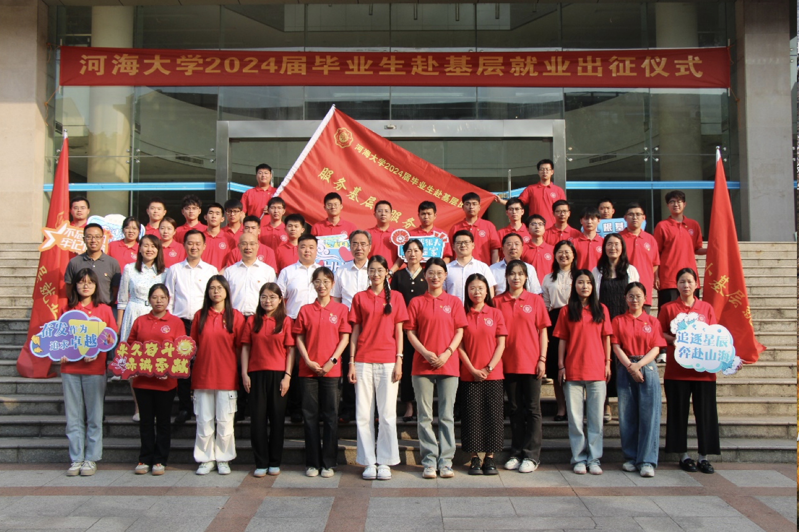 郭继超向选择奔赴基层岗位挥洒青春的同学表示祝贺与祝福。他指出,党中央、国务院呼唤鼓励高校毕业生到基层奉献青春建功立业,近年来学校持续引导毕业生选择基层扎根基层,在“立德树人”中以河海文化作为就业育人基础底色,用河海精神激励着河海学子不断到国家需要的地方展现才干、锻造成才。他对基层就业的同学们提出期望,希望同学们坚定理想信念、努力勤奋学习、敢于创新担当,发挥能力专长,在基层岗位上以扎实的作为绽放青春之花,以优良的成绩书写青春论文,积跬步垒土建高台,在“大哉河海奔前程,毋负邦人期”的壮丽中书写个人理想的“国之大者”。他为2024届赴基层就业毕业生授旗并宣布出征。
