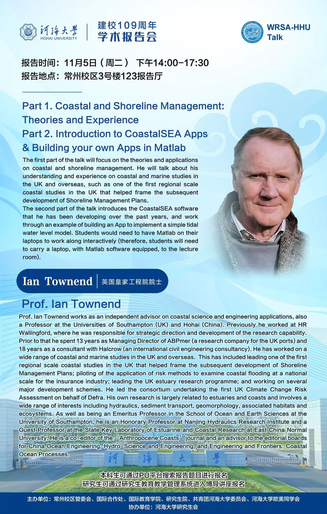 学术报告:[WRSA-HHU Talk] Part 1. Coastal and Shoreline Management: Theories and Experience Part 2. Introduction to CoastalSEA Apps & Building your own Apps in Matlab