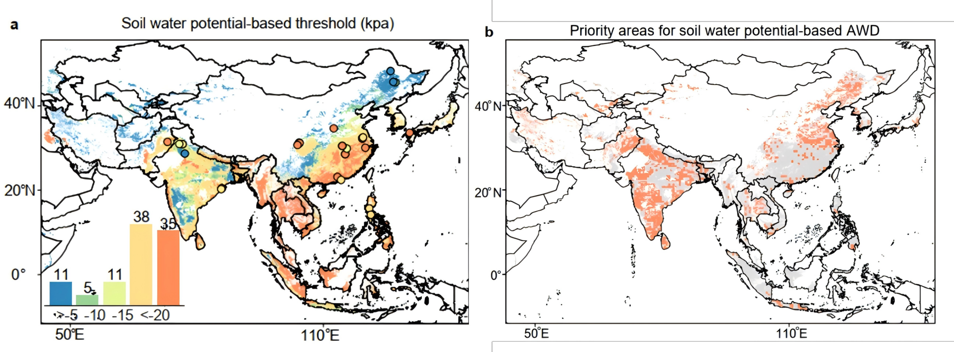 图a柱状图下方数字为土壤水势阈值范围(在空间栅格中以不同颜色区分),柱状图上方数字为相应阈值范围水稻灌溉面积占全球水稻灌溉面积的比例(%)图b橙色区域为新灌溉模式优先推广区