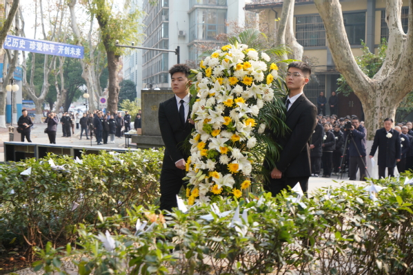 十时整,悼念活动开始。300名师生身着素装、胸戴白花、手持菊花,面向纪念碑列队肃立,齐声高唱国歌。国歌唱毕,随着防空警报声响彻南京上空,全场向南京大屠杀死难者默哀1分钟。默哀毕,学生代表向纪念碑敬献了花篮。87名师生代表在纪念碑前高声朗诵《和平宣言》。随后,全体人员绕纪念碑一周并献花。