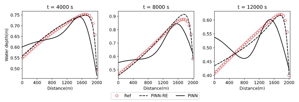 图2  传统PINN和PINN-RE方法求解的不同时刻的沿程水深
