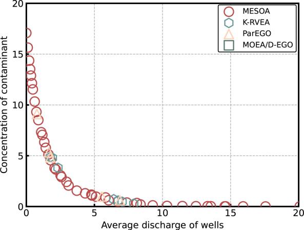 参数率定与方案优化是地表及地下水问题数值模型构建与应用过程中常见且关键的问题。传统求解方法通常需要大量重复运行数值模型,导致计算负荷巨大而优化速度缓慢。对此,研究团队提出了一系列以替代模型为核心的模拟优化技术。针对计算代价高昂的单目标优化问题,团队开发了自适应代理辅助进化算法(AMSMO);针对多目标优化问题,则提出了基于多采样准则的代理辅助多目标进化算法(MESOA)。研究结果表明,AMSMO和MESOA算法在计算时间上仅需传统算法的5%~17%,优化精度也同步提高了75%~89%。本研究成果为高效、精准地解决水资源与水环境模拟优化问题提供了有力支撑,展现出良好的应用推广前景与价值。