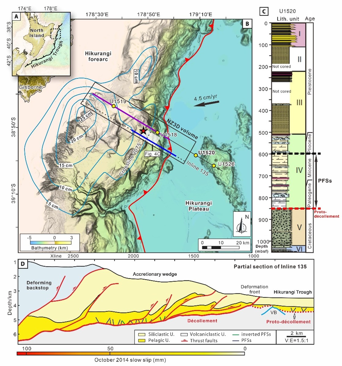 结合NZ3D三维地震速度模型以及大地电磁数据的对比表明,PFSs的重新活化可以为流体运移提供了双重通道效应:既可沿板块界面输送下部楔体的流体,也可导致滑脱层之下富含流体火山碎屑岩的瞬态渗漏。这些现象与楔体底部地层扰动以及剪切应力减弱等现象吻合,因此增强了沿巨型逆冲断层的几何不规则性、流体压力与应力分布的非均质性。综合这些发现表明,俯冲带输入板块中PFSs的激活与增生可能通过此前未被认识的机制,对俯冲带浅部多种慢地震现象的产生起到促进作用。
