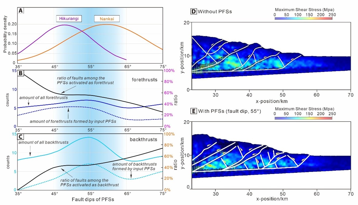 针对上述问题,研究人员结合国际大洋发现计划(IODP)372/375航次钻探结果、基于离散元数值模拟,结合Hikurangi边缘最新采集的三维地震反射数据体(NZ3D)、可控源大地电磁(HT-RESIST)数据解释,来研究输入板块的多边形断层系统(PFSs)在进入俯冲带后,对增生楔和板块边界巨型逆冲断层的运动学与力学影响。采用离散元方法(DEM)建立一系列对比模型,探究不同倾角与间距PFSs在增生楔中的断裂演化过程,最终评估其对增生楔构造演化及板块界面滑动性质的影响。三维地震解释证实紧邻巨型逆冲断层界面的PFSs能够被激活并沿构造走向逐渐演化成主逆冲断层(图2)。研究发现,希库朗吉和南海海槽来临板块中PFSs的典型断层倾角与DEM数值模拟揭示的最有利于激活的断层倾角范围一致(图3)。