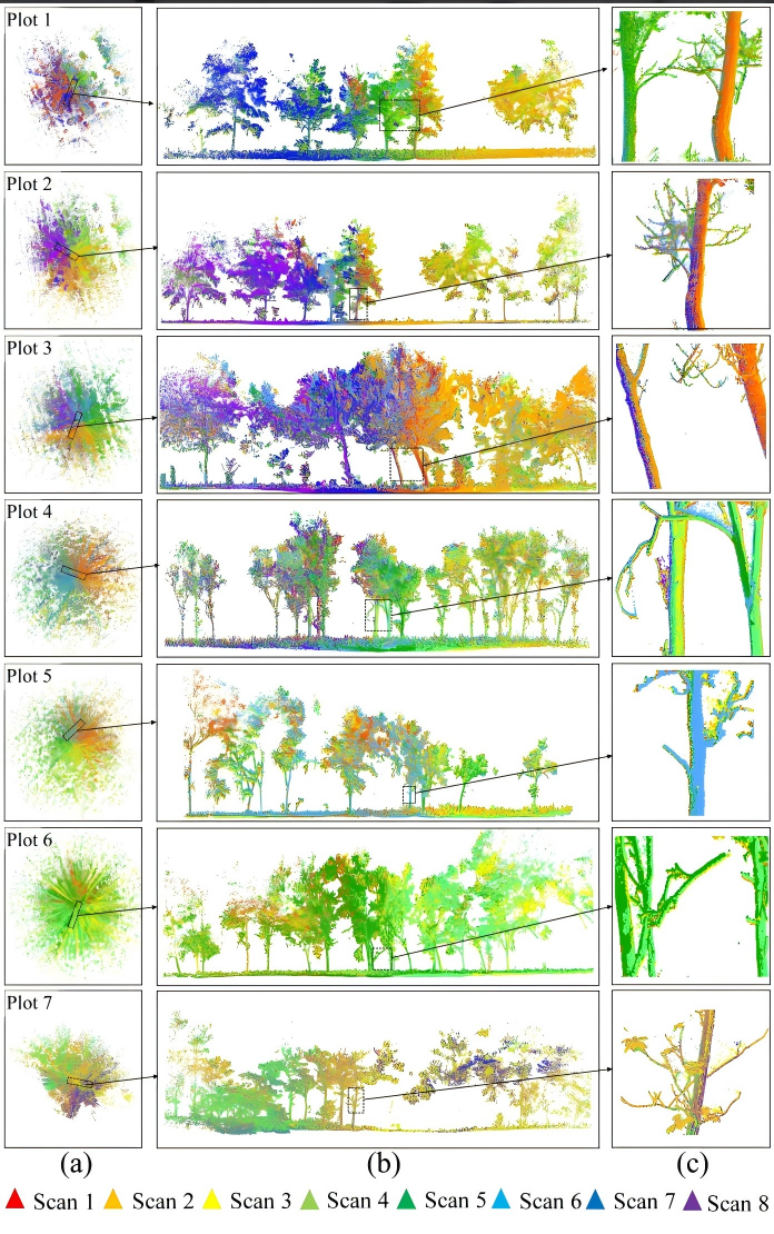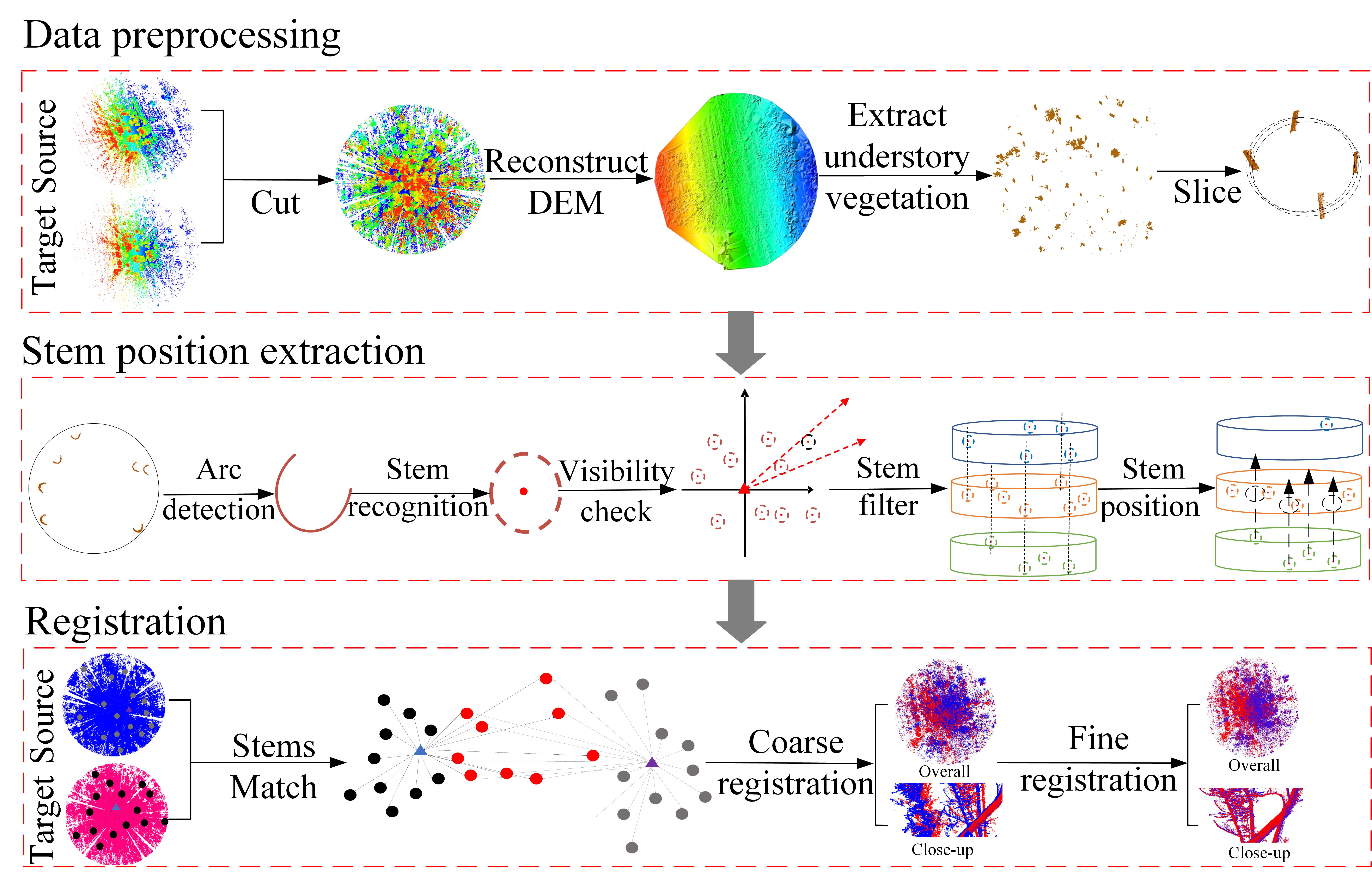 在森林精细结构研究中,地基激光雷达(TLS)能够获取毫米级精度的三维信息。然而,由于树干、枝叶遮挡及设备视角受限,单次扫描往往难以完整记录林分结构,因此需要对多站点TLS数据进行配准。传统配准方法依赖人工布设标靶,操作繁琐且效率低下,限制了TLS在大尺度森林调查中的应用。该研究提出了一种无需标靶的自动配准方法StemReg:首先基于改进的随机抽样一致(RANSAC)算法自适应提取树干候选点,并结合可见性检测和区域生长策略实现精确树干位置识别;然后通过树干空间分布匹配完成多扫描数据的粗配准,并利用迭代最近点算法进一步精细调整。与现有方法相比,StemReg具有更强的鲁棒性和适应性,能够有效处理复杂林分环境。