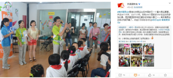 南京青奥会期间担任“国门第一抹微笑”抵离团队志愿者,兼任抵离团队微博负责人,报道发表或转载于共青团中央微博、南京日报等媒体共43条,累计转发量千余次,单条最大阅读量8.3万。发表《抵离团队喜迎第一批来宾》、《抵离团队“搞定”各种突发状况》等稿件于青春南京、南京日报等媒体,被评为“明星志愿者”、“感动青奥人物”、“文化宣传之星”。