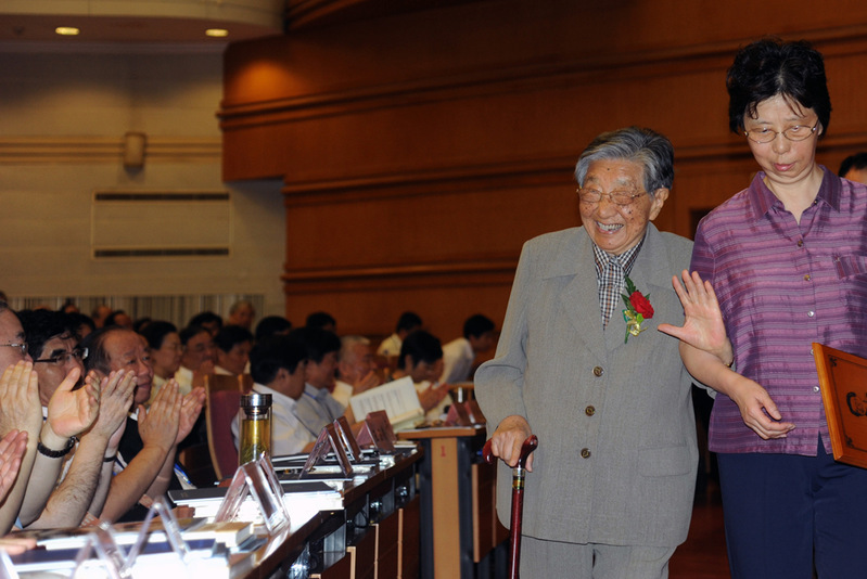 2014年,91岁的钱正英获第十届光华科技奖成就奖。这是钱正英领取奖牌后向鼓掌的院士们招手致意。